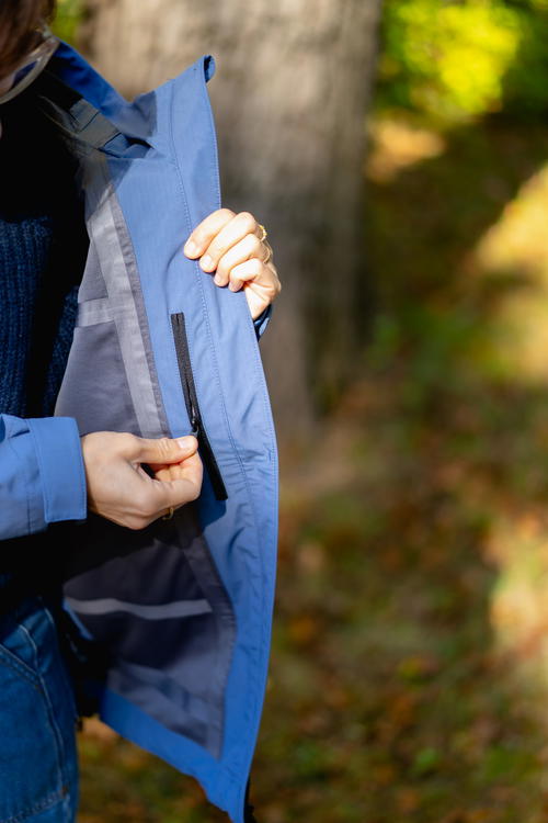 It’s a technical jacket, with features to keep water out and keep warmth in. I used the hood the first time I went out in the rain wearing it, and I adjusted the Velcro sleeve cuffs as well. Two features I also like are the exterior zipper pocket at the chest, and the one inside, too.