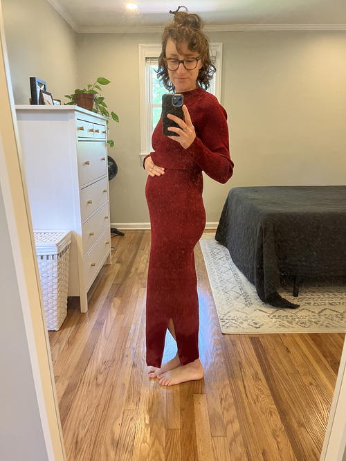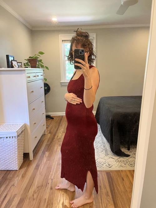This 2-in-1 dress is called a “midi,” but fits me like a “maxi.” I actually don’t have a problem with that: I was looking for maternity maxi dresses in my pregnancy wardrobe, and even though it runs long, it actually does NOT run big. So, this is great news.
