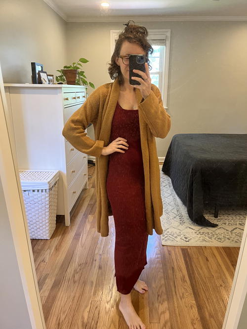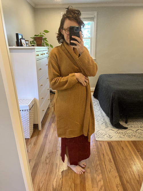 Update! While it’s a cozy piece for home, it has also looked great on me while pregnant when I dressed it up with boots for formal occasions. For my choice of boots, I have this Beckett Simonon review in which I detail all about the elevated leather boots I got during pregnancy that made me feel whole again.