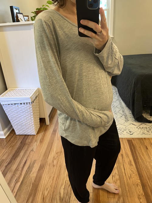 While the top ran pretty spacious and roomy in my first trimester, it was fine because I have worn this pajama set into my third trimester for lounging and sleeping. I even plan to take it in my hospital birth bag as my “cute PJs for the hospital” if I want to feel a little more fashionable than a hospital gown.