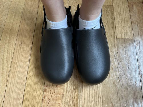 Also, the heel strap is removable, so I can just slide my feet into them. And as they’re pretty lightweight, they can even come in my hospital birth bag.