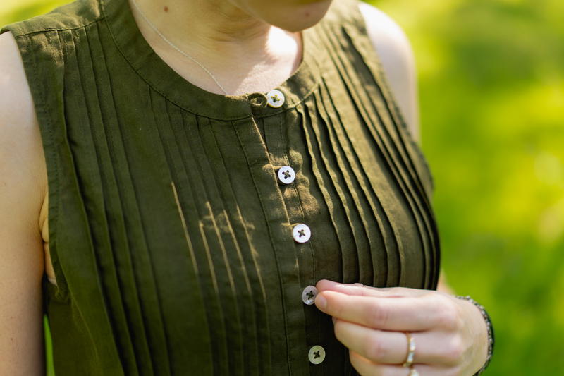I chose not to have this one hemmed, and as you can see in the photo, I might be drowning in it a little bit. It should probably be brought up at the bottom hem by 1.5-2 inches or so. Maybe that is a project for next summer. (My son joined me in this photo!)