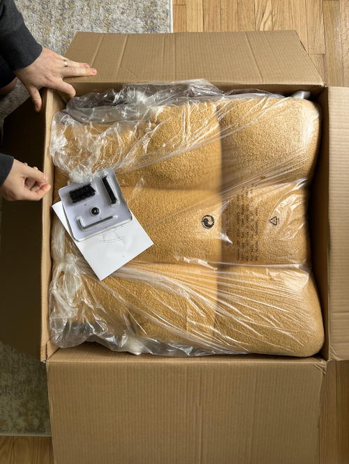 In these photos, you can see how much comes assembled from what we unpacked in the box that arrived. The seat and seatback comes in two parts, and the rocking legs and the frame come wrapped in bubble wrap. There’s an instruction booklet, screws and Allen wrenches.
