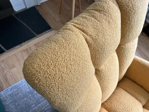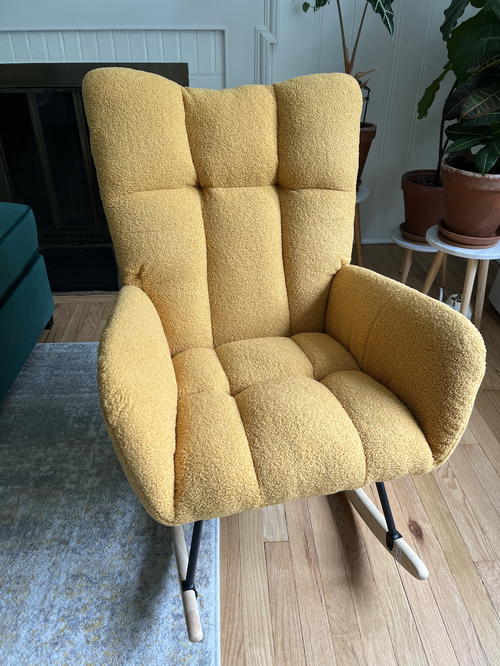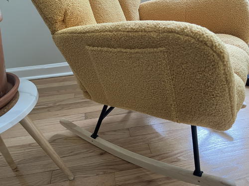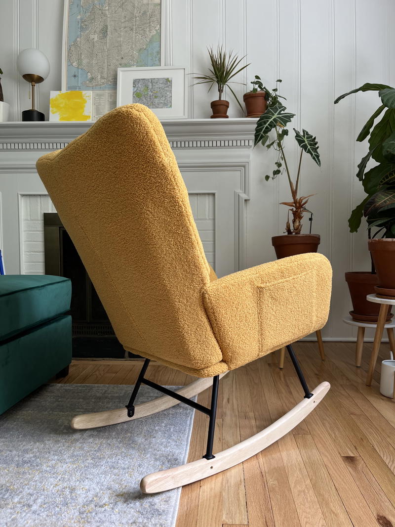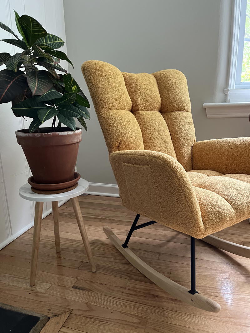 Overall, I’m happy with this chair so far. When I’ve sent photos of our living room design to some friends, they’ve been impressed with the colorful “statement” that this rocking chair makes. I’m enjoying how the dusty yellow goes with our Flexispot velvet green couch.