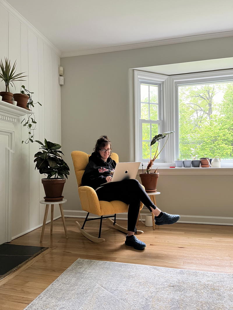 I had never thought that we’d go for a rocker in our living room. We both pictured having a mid-century modern armchair, and we weren’t sure what color. When the opportunity arose to try out this upholstered chair (I chose to get it in yellow), I was excited to see how it paired with our sofa.