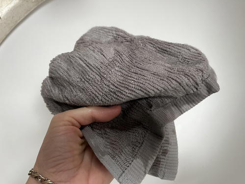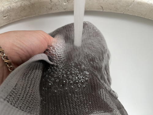 In the photos that follow, I ran one of the Turkish Ribbed Quick-Dry washcloths under water and totally soaked it. Then, I rang it out and hung it up to dry.