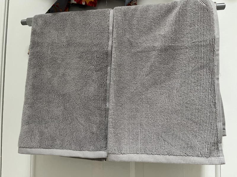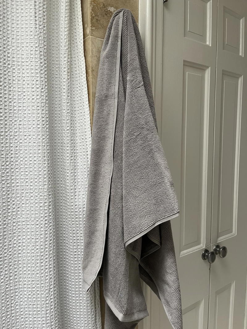 They look uniform and monochrome, and I like the simple edges. You can see how the bath towel looks on the towel hook (next to our shower curtain, which you can learn about at my Quince shower curtain review).