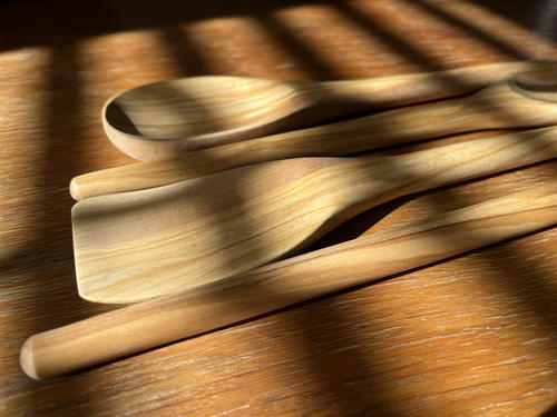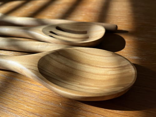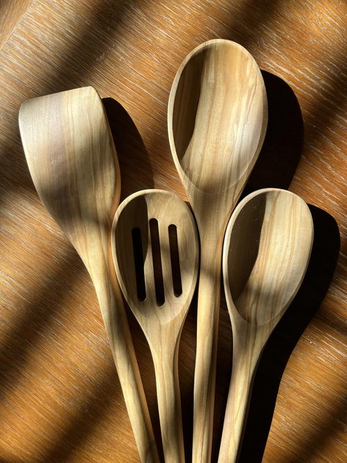 While not made of heavy wood by any means, the Quince olivewood utensils look beautiful, with slender handles, curved spoon bottoms and a slight curve in the “blunt end spoon.” They’re perfect for when we have friends over, or a dinner party, or a potluck.