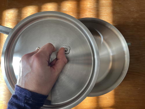 Lids: let’s talk about them! The lid from the saucepan (the pot) is nice, with an ergonomic handle design that’s large enough to use while having my hand in a dish towel for taking it off when hot. Further, the handles is designed to stay cooler than other handles. I’ve nearly burned myself making rice in our current pot, so that’s pleasant news for me.