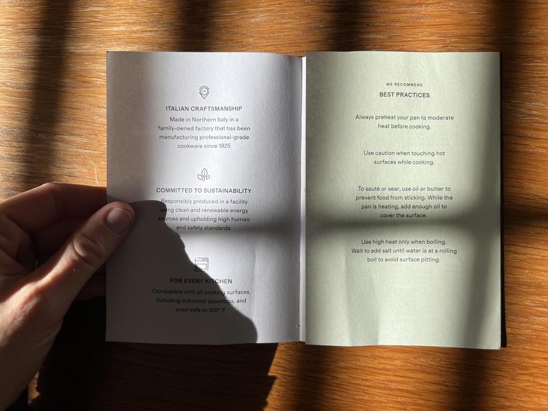 I don’t want to mess up our new Quince cookware, so I read the care pamphlets that each product came with. There are some tips about hand-washing versus using the dishwasher, and some how-to about getting stuck-on food off by using boiling water on the product. It’s all available at the Care 101 page.
