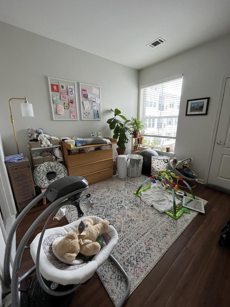 One reason we moved to the suburbs was that our suburban apartment in a complex had more square footage than our 1-bedroom apartment in NYC. Nevertheless, the space got eaten up really fast once we had a baby, and had things like the changing table, a baby swing, baby bouncer, bassinet and play mat, kind of inserted into all of the rooms we had previously led our pre-child adult lives in.