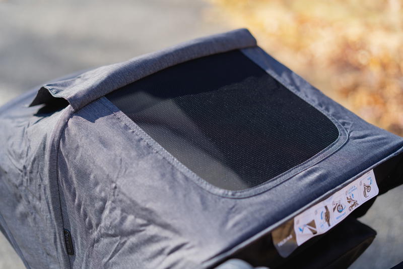 The Essentials Set, which is what we received, includes the stroller, Parent Organizer, Snack and Drink Tray (it’s dishwasher-friendly and Becca is THRILLED) and also the Rain & Weather Shield.