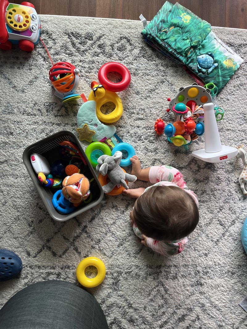 In this photo, all the toys came from Buy Nothing, hand-me-downs, gifts or the babies of friends nearby.