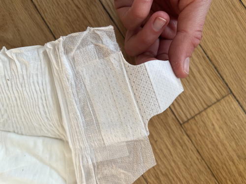 At first feel, it is very silky soft. I was not expecting that (I’m not sure what I was expecting), so that’s a nice surprise. The closure tabs are solid, and the back has a lot of stretch. The flaps for the sides are also wide, which I like in a diaper.
