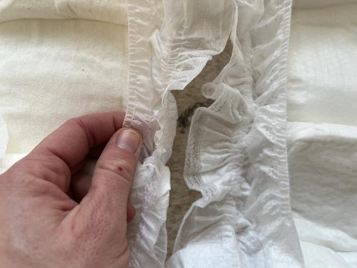 You’ll notice that there are specks in the inside liner of the Kudos diaper in the photo here. Kudos notes that these are the “Natural specks,” from “non-chlorine-bleached cotton.”