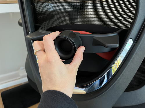 The screw knob for bringing the lumbar support forward and back is very clear; however, it takes a second to figure out that you have to yank the lumbar support panel.